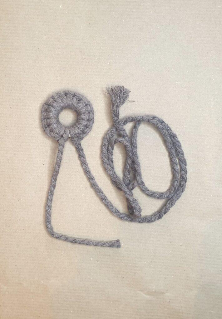 KORAK 5: ko tako obvozljaš cel obroček, odreži daljši konec vrvi na isto dolžino kot krajši ter z 50 cm dolgo vrvico naredi gathering vozel.